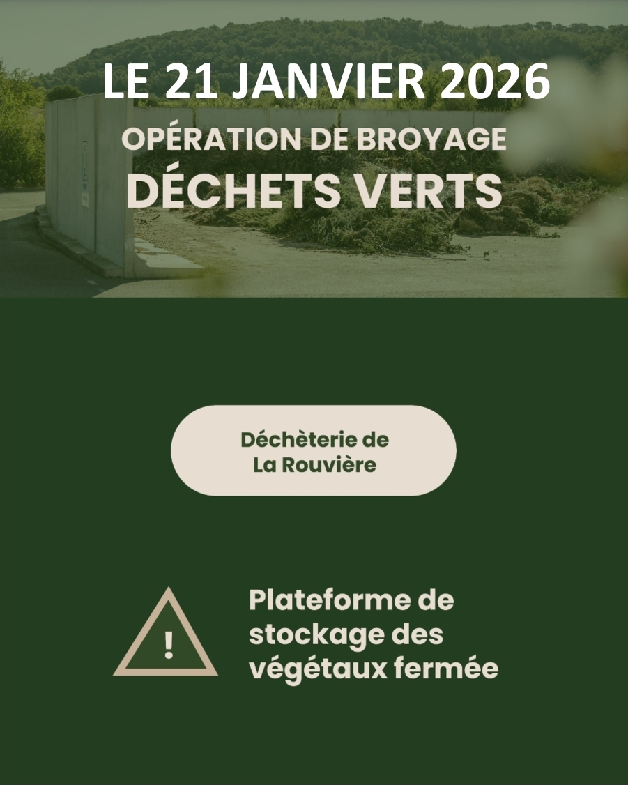 Nous vous informons qu’une opération de broyage des déchets verts est prévue sur la déchèterie de LA ROUVIERE le MERCREDI 21 JANVIER 2026.